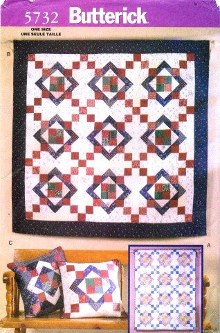 Butterick 5732 Sewing Pattern Aunt Nancy's Quilt: Package includes a brief history of quilting as well as patterns and instruction for Quilt A: 44" (112cm) W x 58" (147cm) L. Quilt B: 52" (132cm); border details. Instructions include converting quilts to wall hangings. Pillow C: 16" (41cm); purchased form. All three projects are done in scrap quilt style, utilizing many small pieces of 100% cotton fabric. Includes machine quilting instructions..../ Butterick 5732 Sewing Pattern Aunt Nancy's Quilt & Pillow / Quilt Pattern